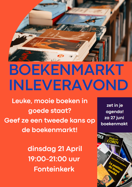 27 Juni word er weer een boekenmarkt georganiseerd in de Fonteinkerk. Op dinsdag 21 April is er een inleveravond.